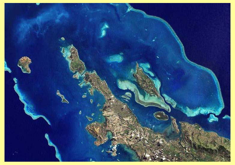 Růst hladin při současném trendu zatopí pobřeží i malé ostrůvky například v Pacifiku. Změní i pobřeží jinak hornaté Nové Kaledonie (na satelitním snímku).