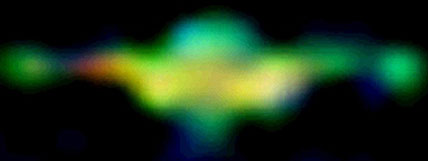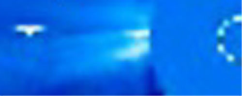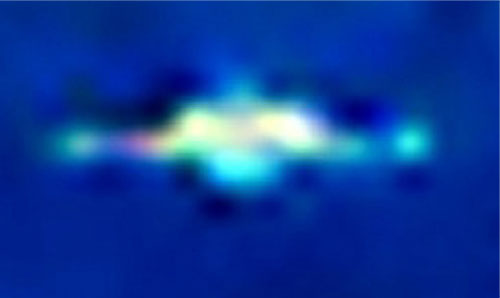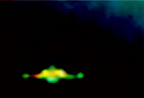Druhé těleso vlétající do obrázku má velmi zvláštní tvar, který při pohledu zezadu připomíná jakousi podélnou krabici se třemi otvory, z nichž vychází jeho "ohon", jak ostatně zřetelně dokumentuje barevné spektrum na obrázku vpravo... (obr.5 a, b) Tak takhle žádná kometa nevypadá.
