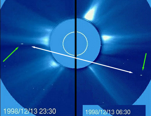 Na obrázku, pořízeném satelitem LASCO 1. května 1998, se poblíž Slunce nachází těleso, které tam vůbec nepatří. Výřez s popisem pochází ze společného oficiálního prohlášení LASCO/NASA, v němž bylo veřejnosti sděleno, že jde o Mars...