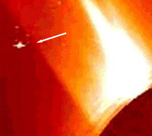 Na živém obrázku (obr.1) je zřetelně zdokumentován případ z 2.6.1998 (SOHO). Vidíme dvě tělesa obrovských rozměrů, která se úžasnou rychlostí přibližují k hvězdě. Letí ve formaci po paralelních drahách. Cílem je patrně kořen ohnivého jazyka protuberance šlehající ze Slunce jako plamen plynového hořáku. Následuje obrovský výbuch - a plamen zhasne...