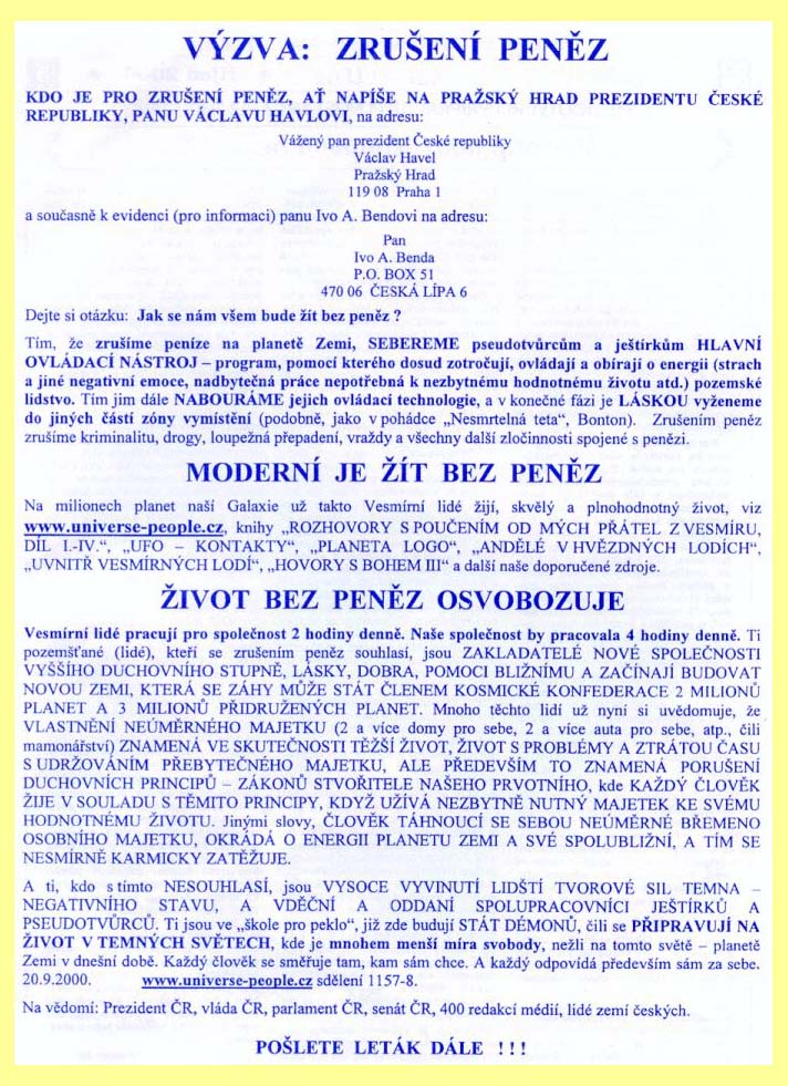 Leták "Výzva: zrušení peněz"