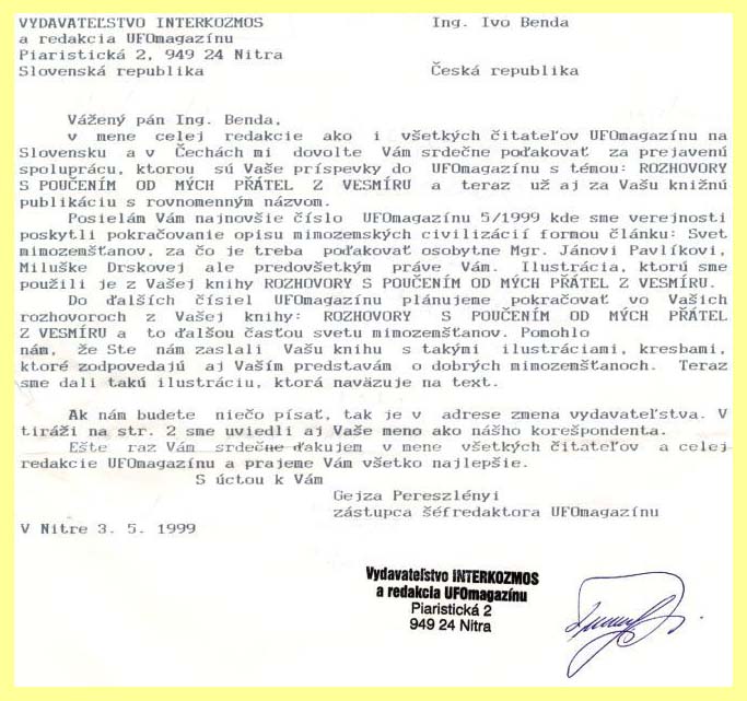 Dopis z UFOmagazínu SR (3.5.1999)
