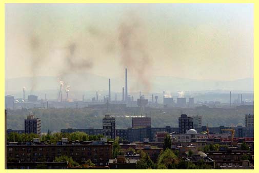 Pohled od západu přes Ostravu. Nad ocelárnami se každou chvíli vyvalí oblak rudého prachu.