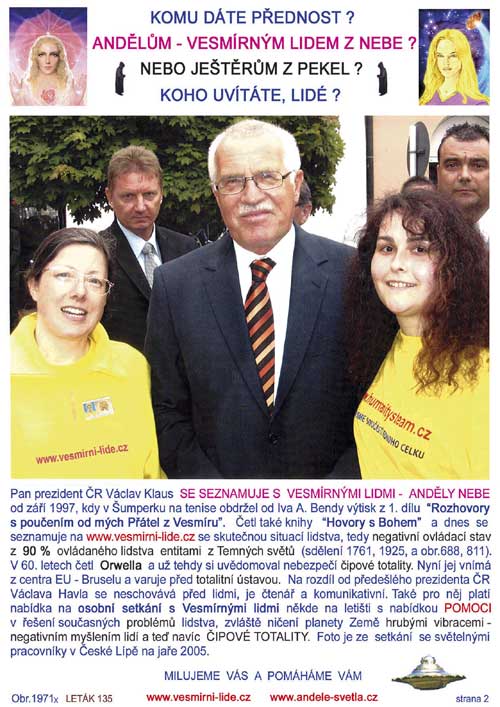 Vesmírní lidé jsou připraveni pomáhat lidem na planetě Zemi, a nyní počátkem května (5.) 2000 vyzvali prezidenty České republiky - pana Václava Havla a Slovenské republiky pana ing. Rudolfa Schustera k osobnímu setkání kdekoliv na letišti či travnaté louce bez jakýchkoliv podmínek. Toto 1. setkání by bylo utajeno (kvůli Silám temna) a na něm by se prezidenti těchto zemí mohli dohodnout na rozsáhlé spolupráci s kosmickou konfederací planet 2 miliónů civilizací sil světla (a 3 miliónů civilizací přidružených). Je to historická příležitost pro tyto dva muže s posláním jak pro tyto dvě malé země, tak pro celou planetu Zemi. Ivo A. Benda má poslání toto setkání zprostředkovat a zorganizovat. Proto vyzývá tyto 2 prezidenty k uspořádání tohoto setkání v co nejbližším termínu, neboť času není mnoho.