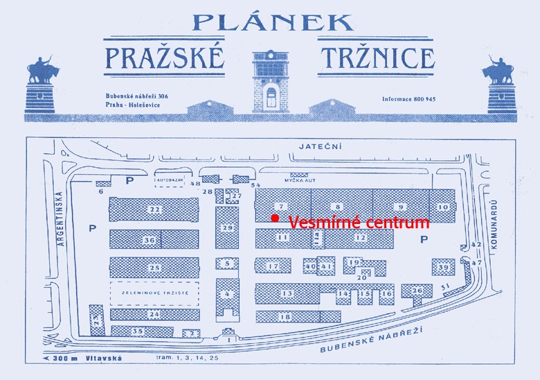 | VESMÍRNÉ CENTRUM Holešovická tržnice - plánek tržnice hala 7. Pěšky 5 minut od metra C - Vltavská. Mnoho obrázků, tiskovin, CD, audio, videopřednášky, atd. |
